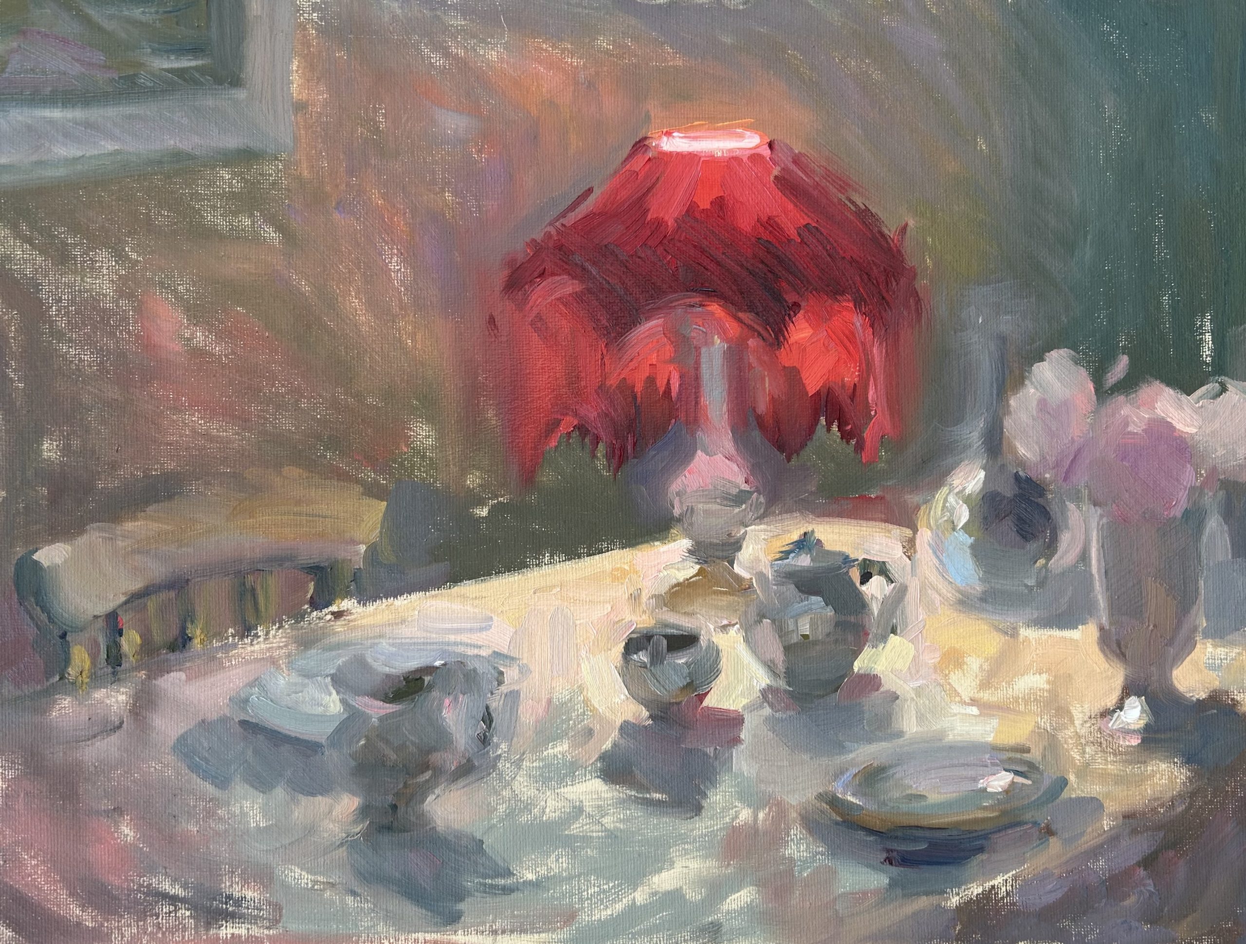 Evening round the table£550.00 Oil on panel 30 x 40cm unframed 1 in stock Evening round the table quantity Add to basket Categories: Interiors, Still Life, Strada Easel Paintings 2026 Related products Jugs and Apples, Autumn sold• Read more Roses in red vase Read more Snowdrops and silver Read more Roses and Milk Jug £450.00 Add to basket