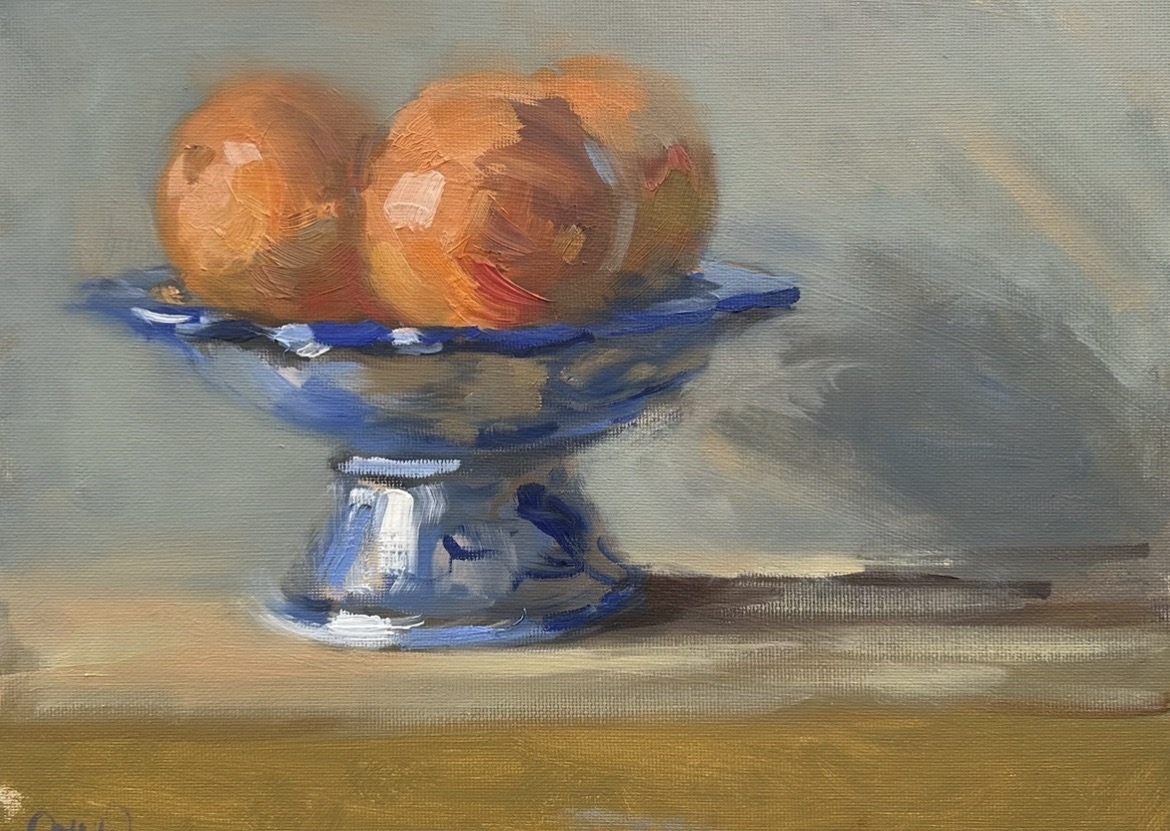 Oranges on Blue and White China Server£425.00 Oil on Panel 30 x 23cm Unframed 1 in stock Oranges on Blue and White China Server quantity Add to basket Category: Latest Works Related products Girl at the Mirror £750.00 Add to basket Stubbs ‘Whistlejacket’ on chair (sketch) £200.00 Add to basket White and Blue China Bowl £450.00 Add to basket Blue and White China Vase £425.00 Add to basket