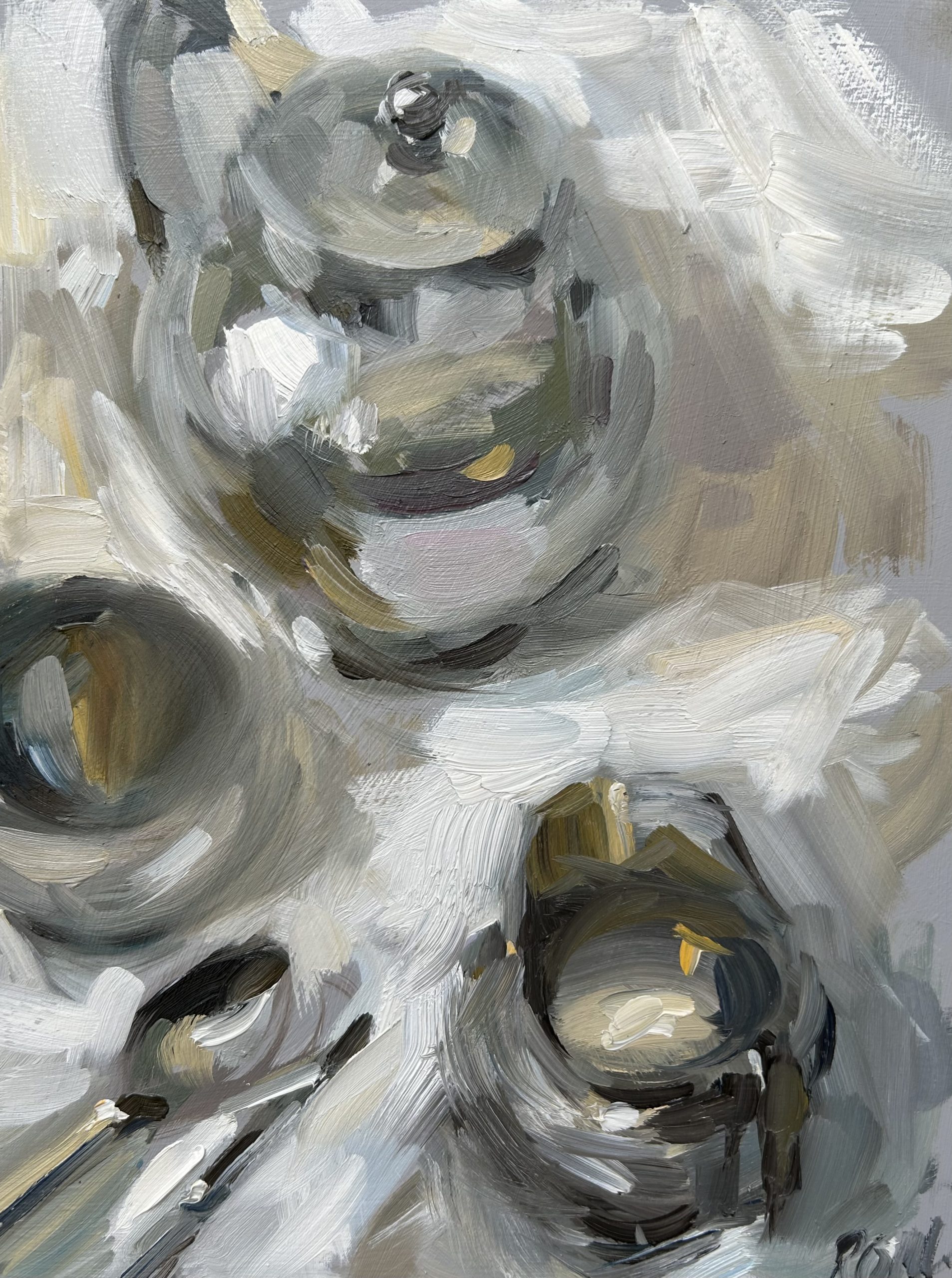 Silver Tea Set on White£350.00 Oil on panel 24 x 18cm unframed 1 in stock Silver Tea Set on White quantity Add to basket Categories: Still Life, Strada Easel Paintings 2026 Related products Milk jug study Read more Daffodils with Silver £700.00 Add to basket Red in Cut Glass £500.00 Add to basket Bowl and Pitcher, Contre Jour £500.00 Add to basket